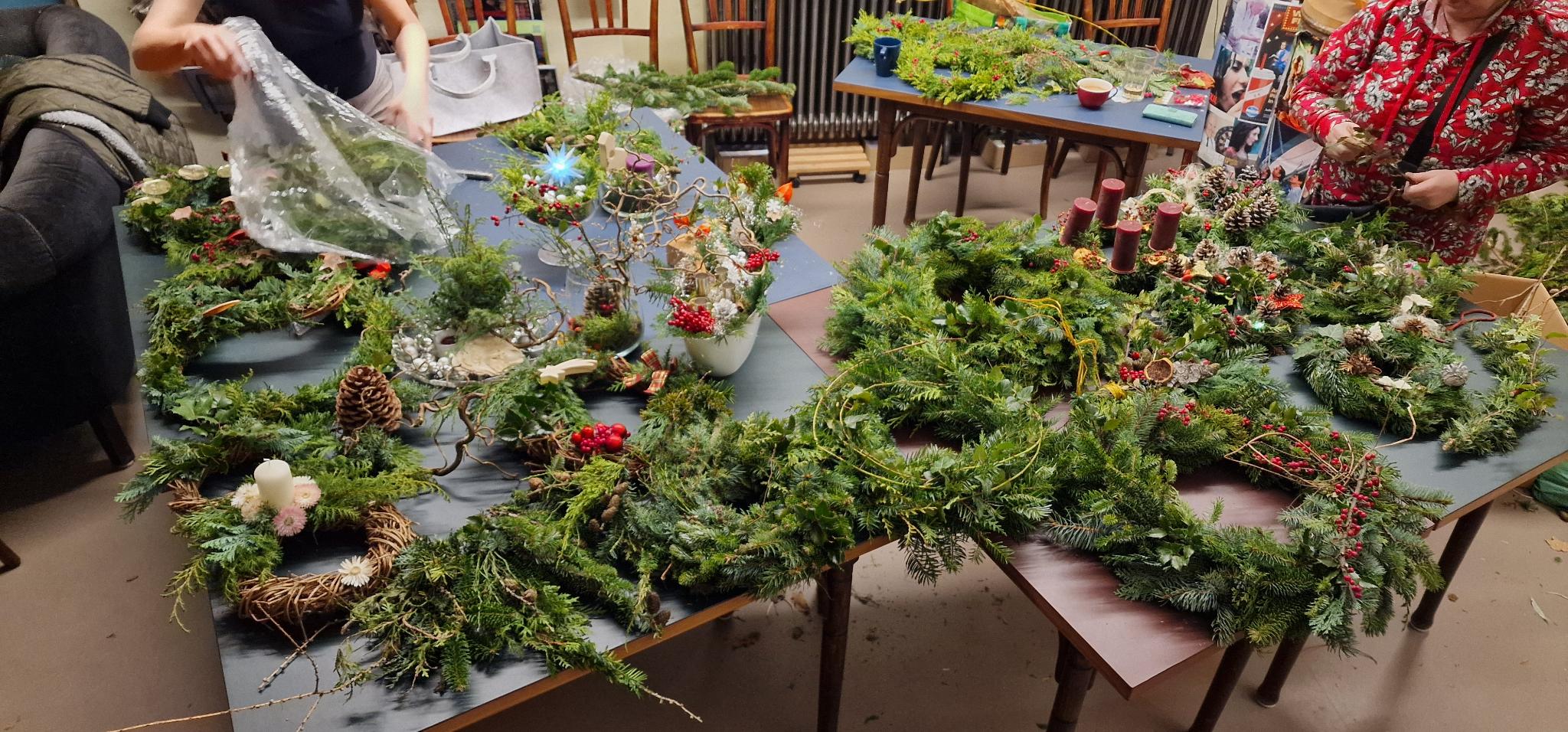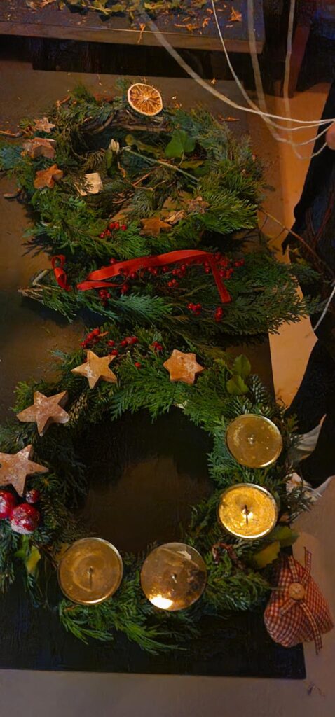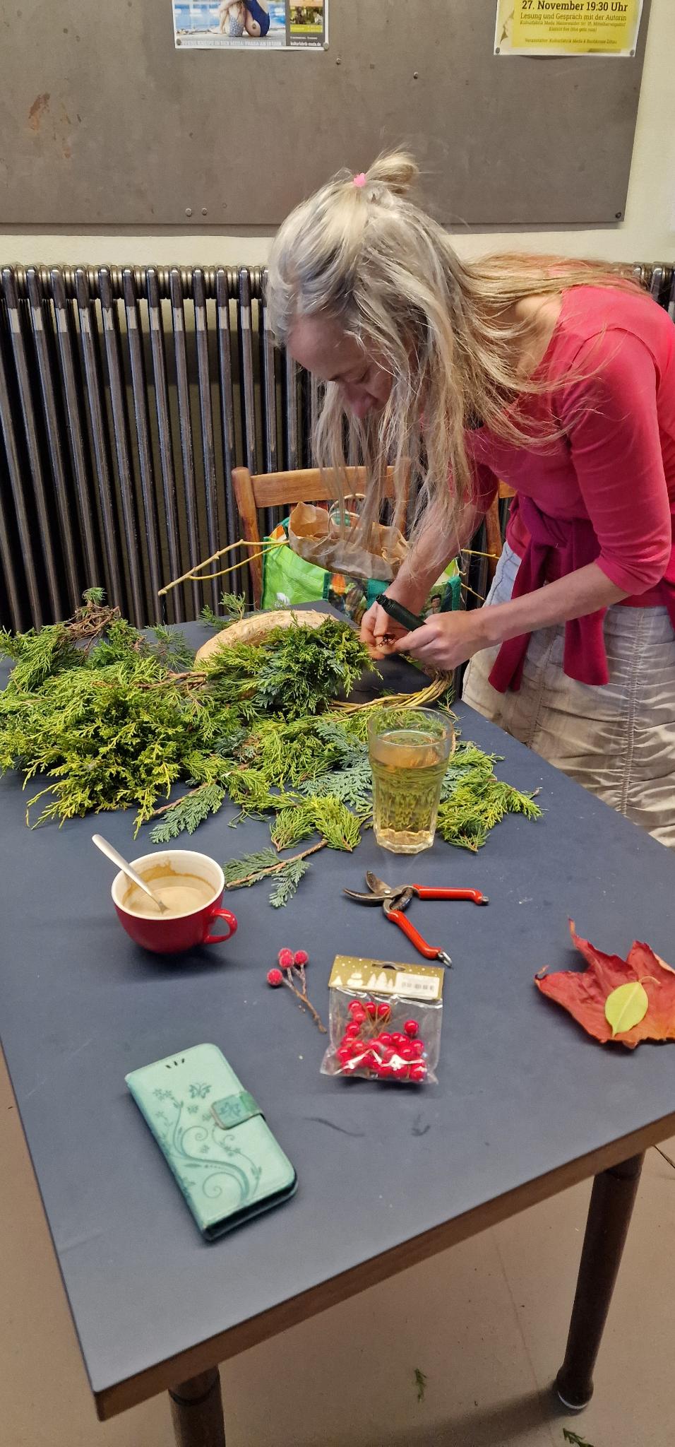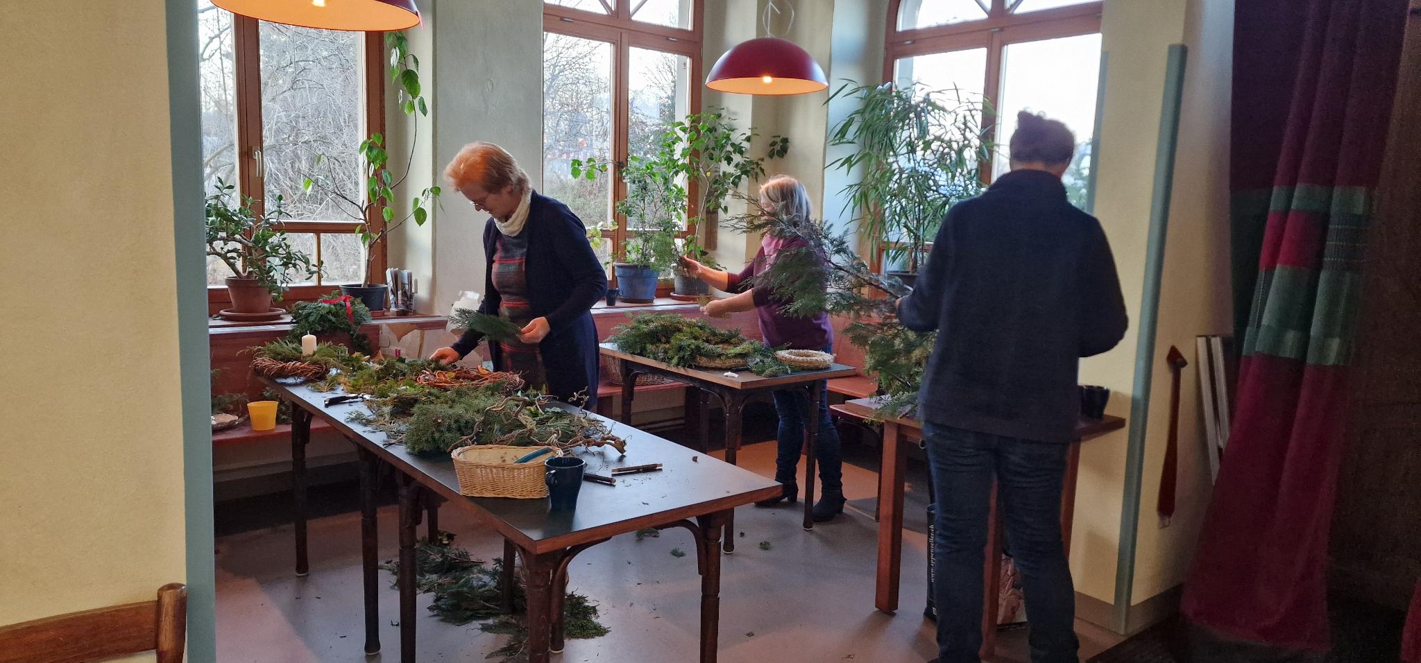 Veranstaltungen / Nachlese Weihnachtliches Adventskranzbinden So 23.11.2025 | ab 16:00 Uhr Wir laden wieder ein zum gemeinsamen (vor-)weihnachtlichen Gestalten von Adventskränzen und Gestecken mit Naturmaterialien und schönen Deko-Ideen, zum Austausch und Wohlfühlen. Es gibt Tee, Kaffee und Kuchen. Eindrücke vom Adventskranzbinden 2025: